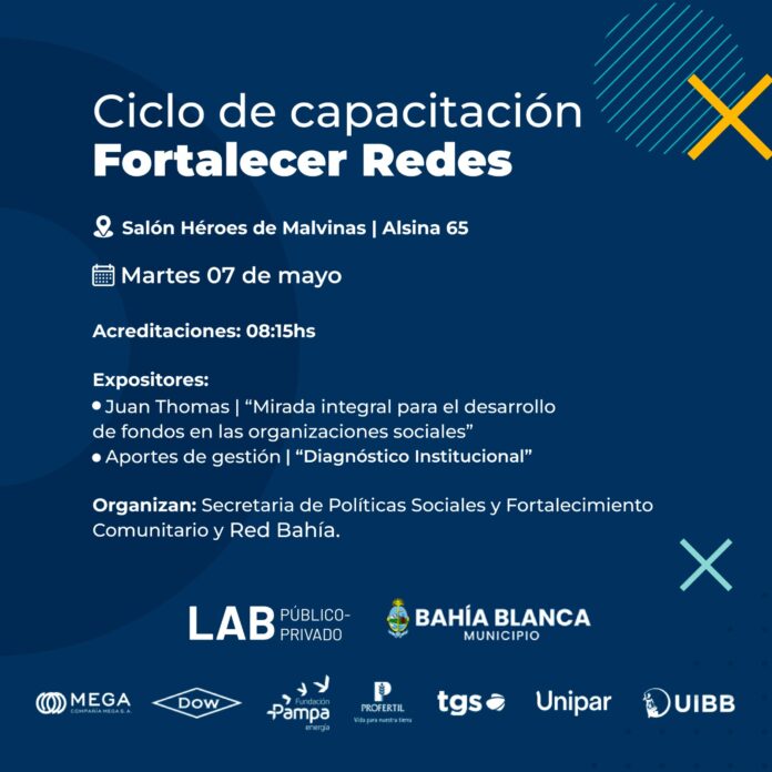 La Secretaría de Políticas Sociales, Red Bahía (conformada por las empresas Compañía Mega, Dow, Pampa Energía, Profertil, TGS, Unipar y Unión Industrial de Bahía Blanca) y el LAB (Laboratorio Público-Privado), invitan a participar del Ciclo de Capacitación “Fortalecer Redes”.